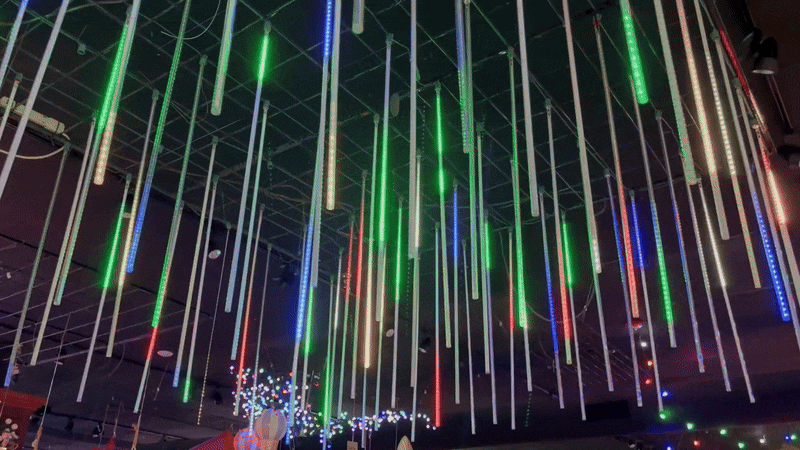Meteor lights create a cascading effect, with light falling from top to bottom like glowing raindrops